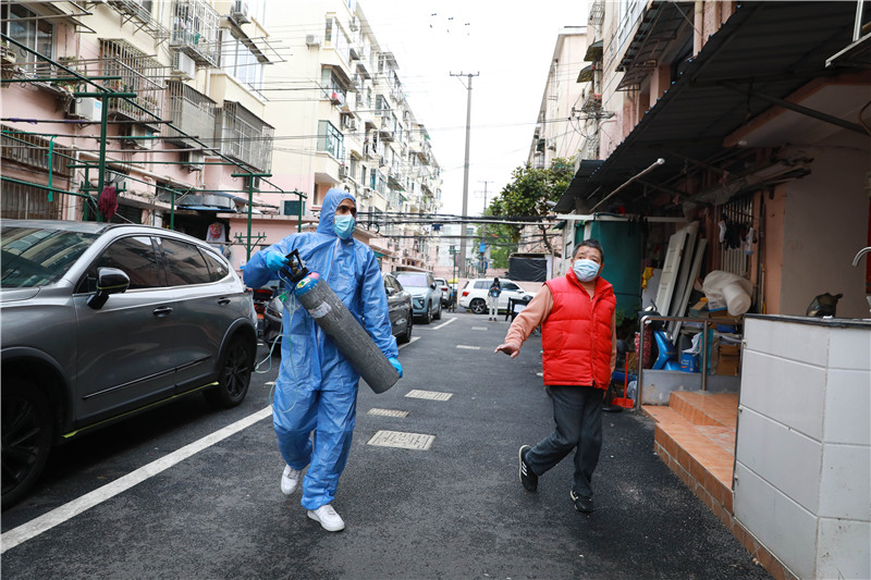 4月15日,在上海市徐汇区枫林新村小区,尼泊尔志愿者Shankar Koirala为居民送氧气瓶。(中国日报记者 朱兴鑫 摄)