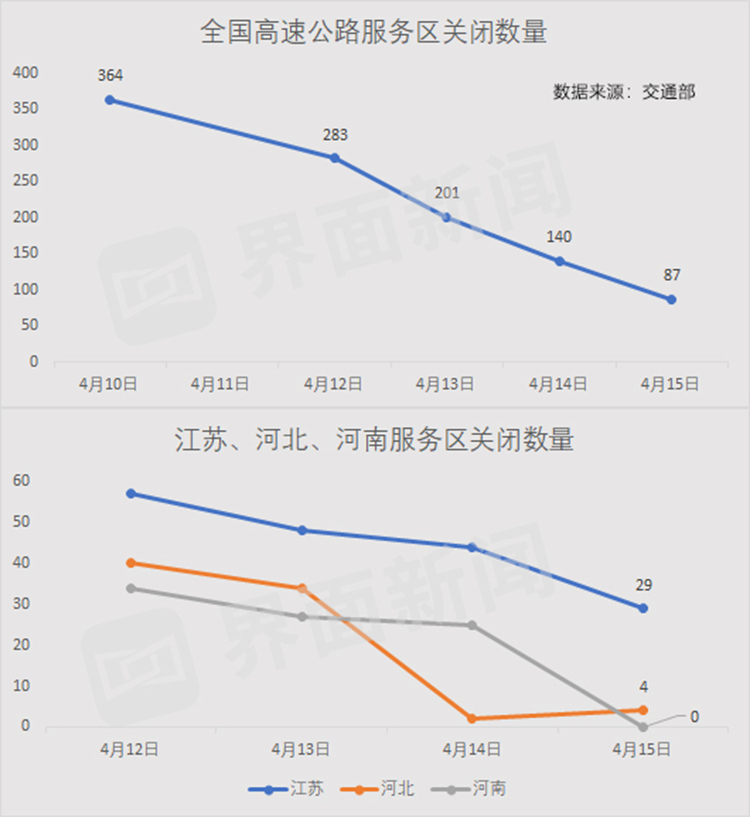 与4月10日相比,全国服务区关闭数量下降了76.10%。4月12日时,服务区关闭数量最多的省份是江苏、河北、河南。目前河南已经开放所有服务区,河北只关闭了4个,江苏仍有29个服务区处于关闭状态。