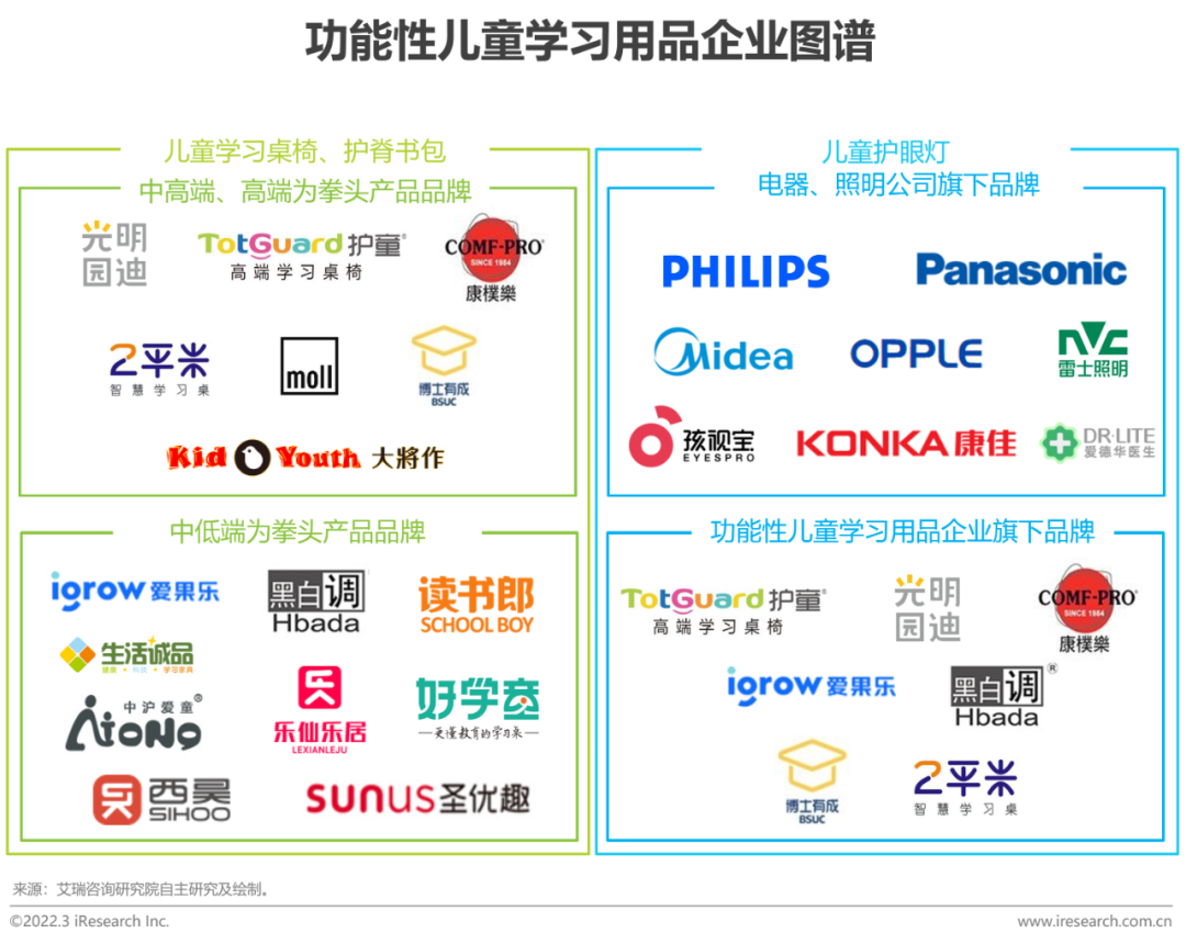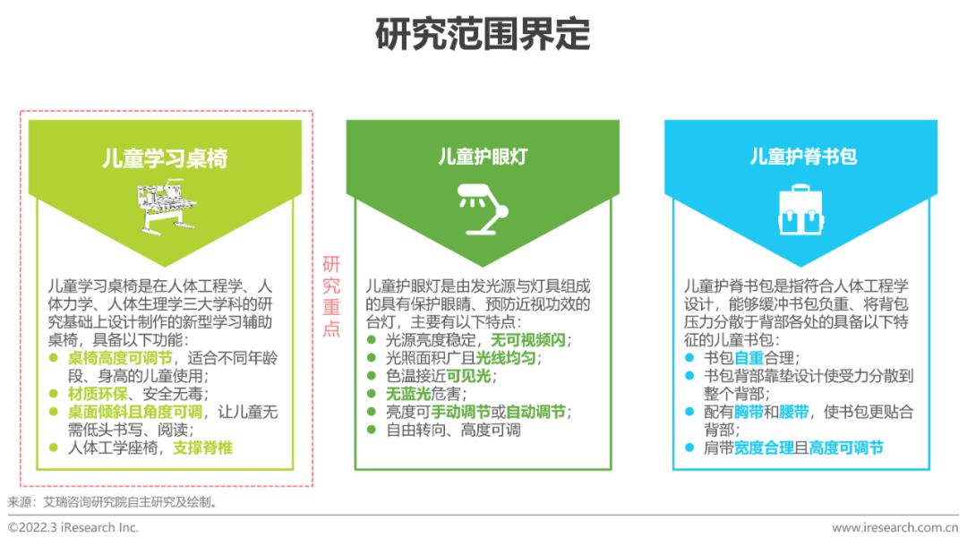 基于人体工程学原理设计的能适应孩子当前体型、个人成长需求的学习桌椅、台灯、书包等本报告所研究的功能性儿童学习用品是指能适应儿童当前体型、个人成长需求的学习用品。在满足儿童日常学习使用的基础上,应用人体工学原理及功能化设计使其具备为儿童营造健康学习环境,有益于儿童的视力保护、脊柱健康、良好学习及生活习惯养成等一项或多项附加功能的儿童学习用品,主要包括儿童学习桌椅、儿童护眼灯、儿童护脊书包等,其中儿童学习桌椅在儿童健康学习生活中扮演着最为重要的角色,也是此次研究的重点。