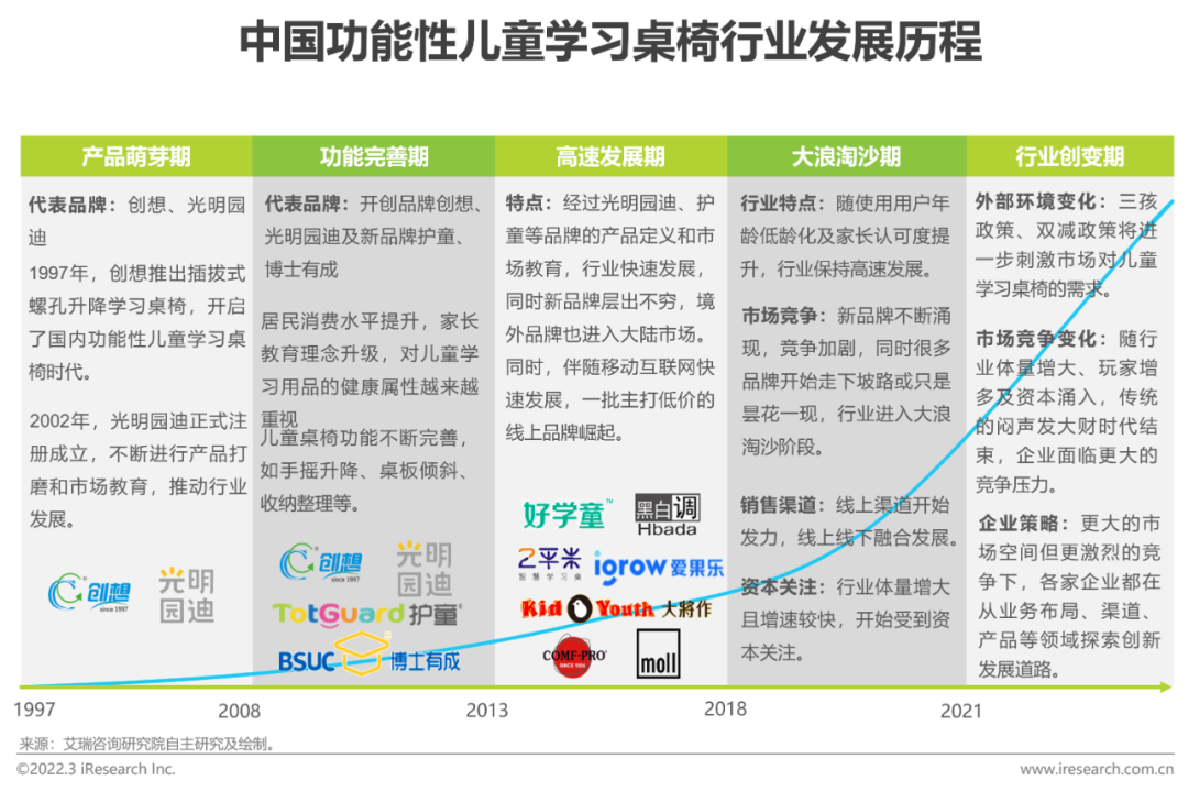 行业发展历程大浪淘沙后,行业进入创变期我国功能性儿童学习用品在20世纪末、21世纪初开始萌芽,创想、光明园迪成为行业拓荒者。产品经过不断的打磨,功能逐步完善,产品认可度提升,更多的市场参与者加入,供需相互促进下,行业在2013年后迎来高速发展期。但随着行业规模扩大,市场竞争愈加激烈,行业大浪淘沙,一些积淀不够扎实的品牌逐步退出市场,剩下的头部品牌在更激烈的市场竞争下开始探索自身的创新发展道路。