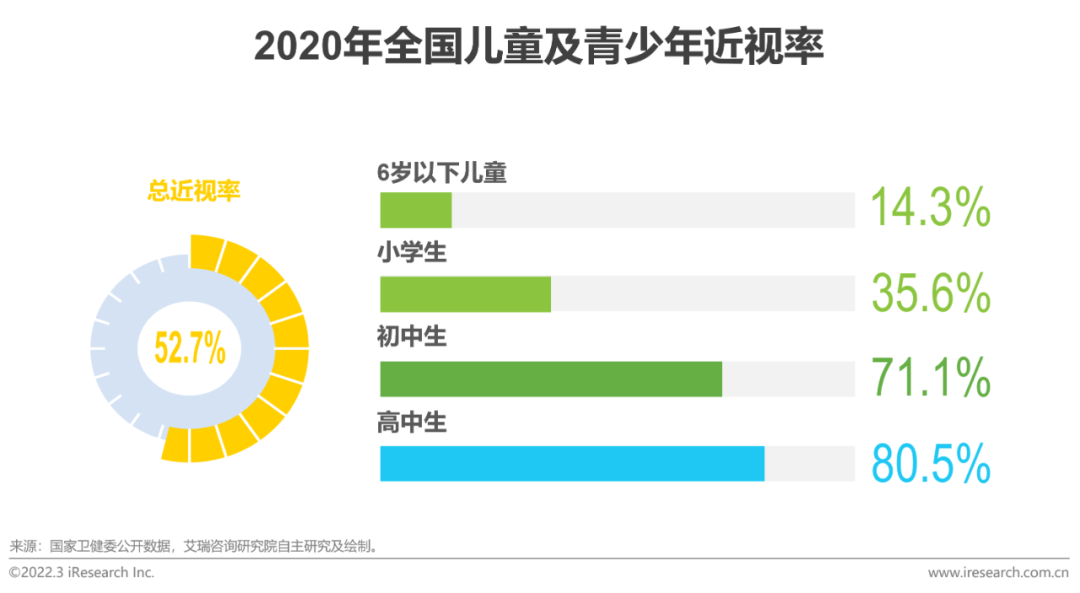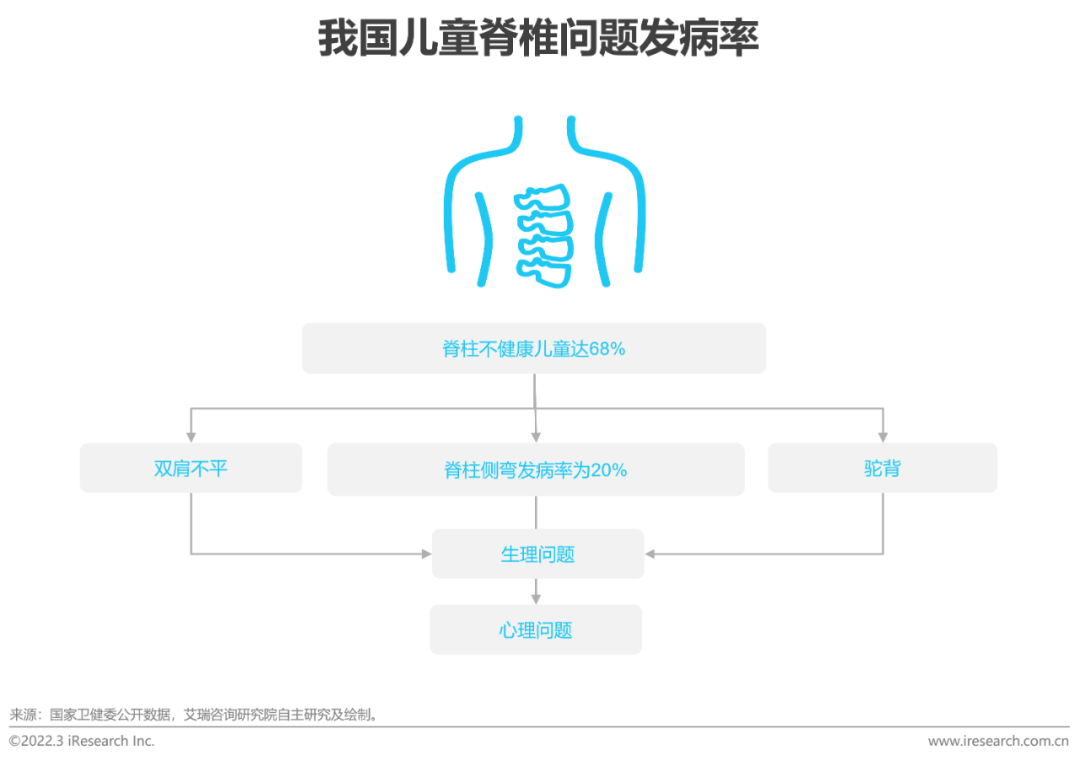 驱动因素:儿童健康问题引发关注儿童近视与脊柱问题突出,引发生理及心理问题随着学生学习负担的加重以及电子设备的频繁接触和使用,不健康的用眼方式、用眼过度、坐姿不良等问题使得儿童视力健康问题形势严峻,近视率居高不下。据卫健委信息,2020年,我国儿童青少年总体近视率为52.7%,较2019年上升了2.5个百分点,其中高中生的近视率高达80.5%。2021年5月教育部等十五部门印发《儿童青少年近视防控光明行动工作方案(2021—2025年)》,全面开展儿童青少年近视防控光明行动,健全完善儿童青少年近视防控体系。除近视问题外,儿童脊椎、脊柱问题也不容忽视。据中国儿童发展中心调查统计,我国脊柱不健康的儿童已高达68%以上,包含有驼背、脊柱侧弯、双肩不平等,其中脊柱侧弯的发病率约有20%。脊柱问题对孩子的生理及心理都会带来负面影响,成为儿童健康成长的一大障碍,而功能性学习用品的普及恰恰有助于破除这一障碍。