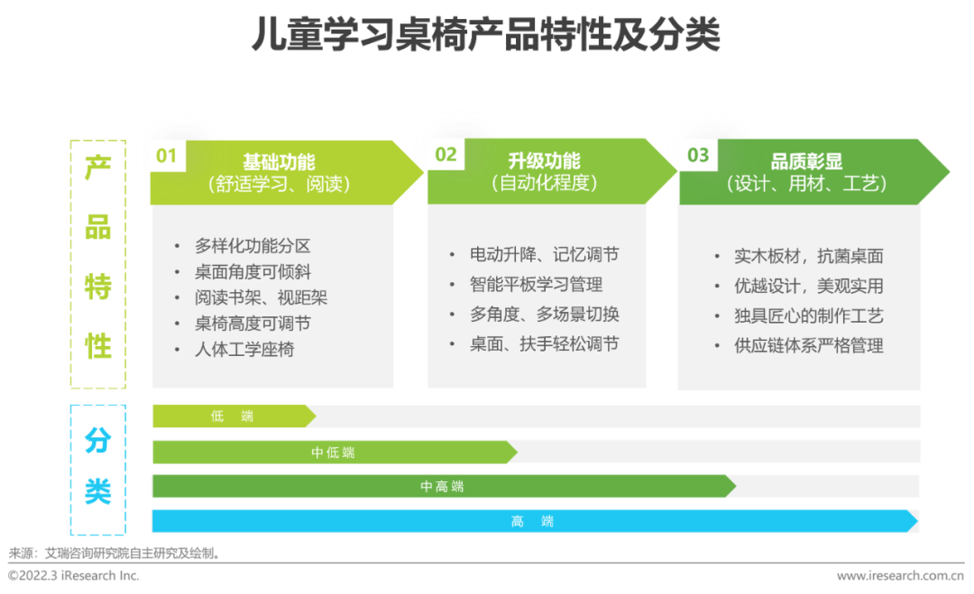 基础功能基本具备,高品质竞争态势凸显书桌作为传统的家居产品,产品功能相对单一,切入儿童学习场景后,产品功能和用户需求逐渐多样化。根据价格区间及产品功能丰富性,大体可将儿童学习桌椅分为低端(1000元以下)、中低端(1000-3000元)、中高端(3000-8000元)和高端(8000元以上)四类,本报告所称学习桌椅指售价在1000元以上的中低端及以上产品。由于产品功能、生产工艺等已经相对成熟,儿童学习桌椅各品牌已基本具备了如桌面分区、高度调节等基础功能,部分品牌也具备了一定的自动化程度功能,此时品质的坚守和彰显就至关重要,这就体现在设计、用材、制作工艺等各个方面。