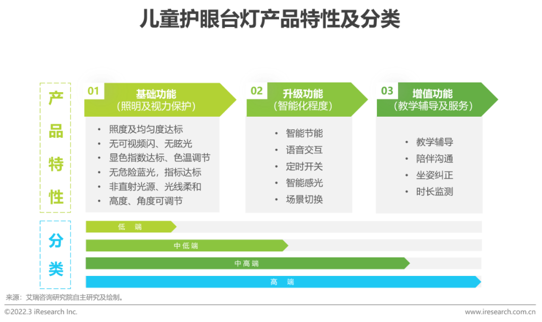 产品特征:儿童护眼台灯基础功能差异小,智能化、教学辅导等增值功能凸显竞争力“护眼台灯”顾名思义,其核心功能就在于视力保护和照明,这也是用户在产品选择时的核心需求。根据价格区间及产品功能的丰富性,同样可以将儿童护眼台灯划分为低端(100元以下)、中低端(100-500元)、中高端(500-1000元)和高端(1000元以上)四类,本报告所称儿童护眼台灯指售价在100元以上的中低端及以上产品。2017年,《读写作业台灯性能要求》最新标准出台,对宣称“护眼”台灯的各项技术指标如频闪、照度等做出硬性规定,对产品质量做出进一步规范。根据既定的性能要求和国AA级标准,儿童护眼台灯产品基础性能差距已很小,护眼台灯未来的较量和竞争可能更多体现在升级功能及增值服务功能中。
