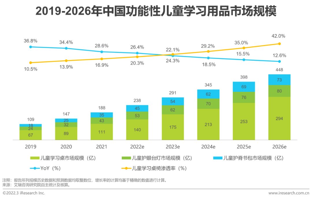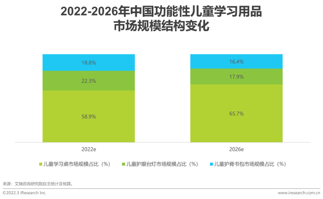 功能性儿童学习用品市场规模预计2022年市场规模238亿,儿童学习桌椅占58.9%据艾瑞统计核算,预计2022年学习桌椅、护眼台灯、护脊书包三类产品总体市场规模将达238亿元,未来几年仍将保持较高速度增长。其中儿童学习桌椅由于刚需性强、功能多样、产品单价高等因素,占据58.9%的份额,且未来份额仍将提升。从渗透率看,功能性儿童学习桌椅目前渗透率不足20%,仍有较高提升空间。