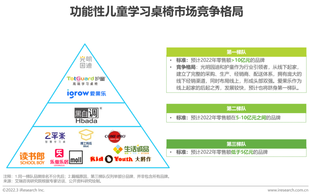 竞争格局光明园迪、护童形成头部双强,爱果乐后来居上儿童学习桌行业发展浪潮中,光明园迪和护童作为行业早期进入者和引领者,从线下起家,建立了完整的采购、生产、销售、服务体系和庞大的线下渠道,品牌底蕴更深,形成头部双强。爱果乐作为新兴“淘品牌”,近几年快速发展,也跻身于第一梯队。