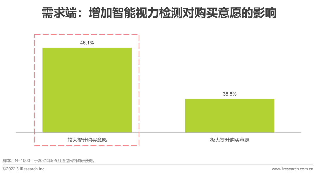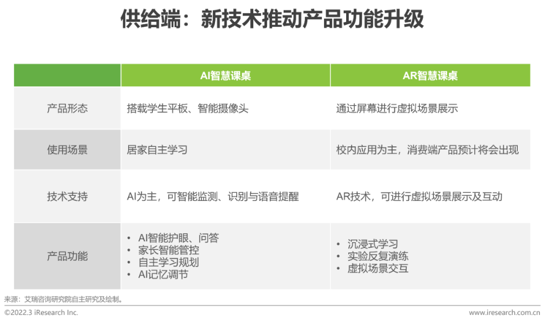 技术环境变化AI、大数据、AR/VR等新技术推动产品功能升级从供给端来看,随着AI、大数据、VR/AR等新一代信息技术向教育领域的不断渗透,传统的儿童学习桌椅也逐步增添了智能化色彩,如搭载学习平板的AI智慧书桌,以及可以进行虚拟场景展示的AR智慧课桌,都使得儿童学习桌椅的智能化功能不断凸显。从需求端来看,问卷调研数据显示,对于46.1%的用户而言,增加智能视力监测功能可以较大提升其购买意愿。