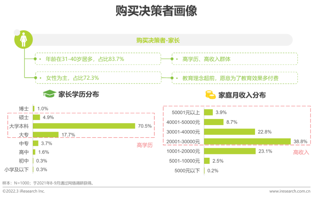高学历、高收入的31-40岁宝妈为主,教育理念超前功能性儿童学习用品的购买决策者以高收入、高学历的女性年轻家长为主,教育理念先进,对教育质量的追求和先进知识的热情,使其有较高的付费意愿,她们更愿意为了高科技产品付费,同时也看重产品的文化积淀和品质内涵。