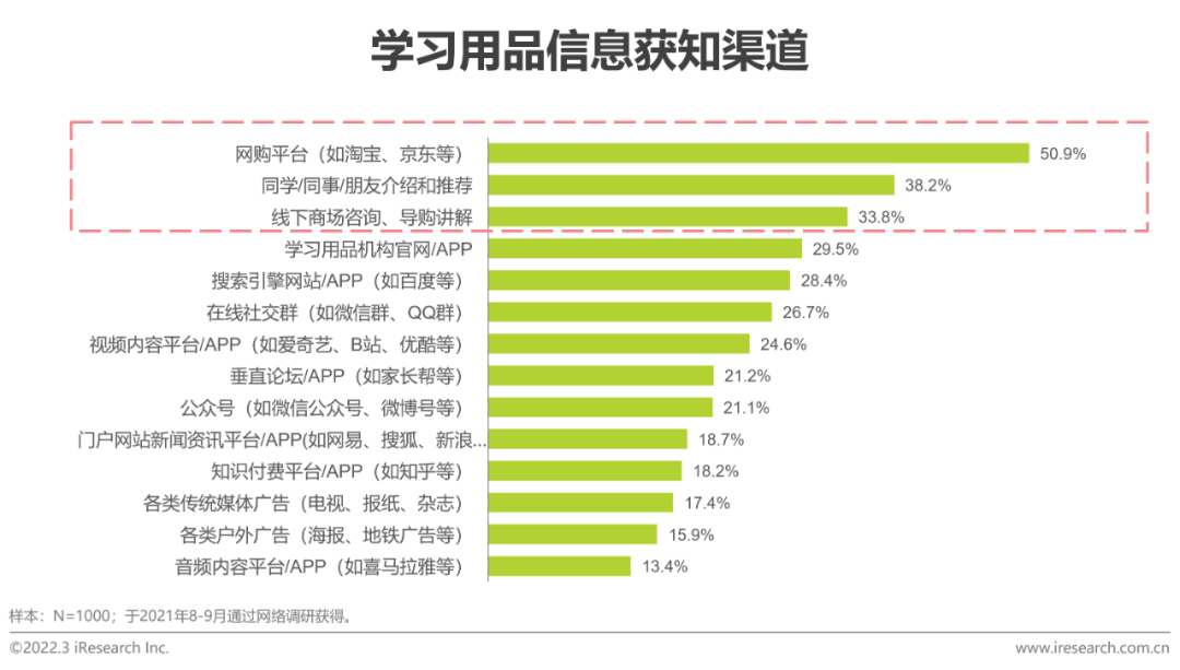 宝妈的信息来源有哪些?网购平台渗透率最高,其次是熟人推荐和商场咨询从功能性儿童学习用品信息获取渠道看,线上渠道占据一定优势,通过网购平台获知的用户高达50%以上,同时搜索引擎、在线社交群、视频内容平台等占比也较高。线下渠道中,熟人推荐有着不可替代的作用,口碑效应明显,同时线下实体店的亲身感受、现场咨询、导购讲解作用也十分突出。