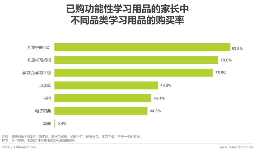 哪些学习用品最受家长青睐?护眼台灯在功能性儿童学习用品中购买率最高;购买功能性儿童学习用品的家长还喜欢购买点读笔等产品对于已购至少一类功能性儿童学习用品的家长,83.8%都购买了儿童护眼台灯,可见台灯是最刚需的品类;有78.0%的家长购买了儿童学习桌椅,刚需性略低于护眼台灯,但已达到了较高水平;同时,学习平板的购买率也已经非常高,达到75.5%。此外,我们看到,有49.3%的购买功能性儿童学习用品的家长还为儿童购买了点读笔。对于儿童学习桌生产销售企业,可考虑向点读笔等品类扩张,形成销售资源的协同。