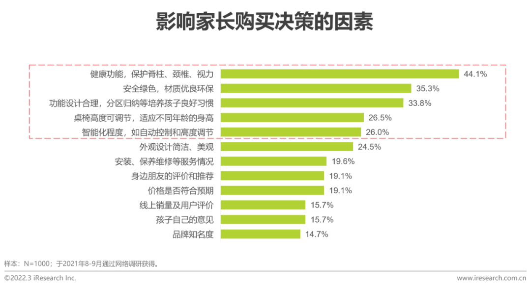 学习桌椅-家长最关心什么?使用健康最重要,包括人体工学设计和材质安全;功能设计合理很加分使用健康是用户最核心的关注点,一是学习桌椅的设计要符合人体工学原理,能有效保护孩子的脊椎、脊柱和视力;二是学习桌椅的材质要绿色环保,对儿童身体没有伤害。在健康的基本盘上,学习桌椅的功能设计是很大加分项,如分区归纳、增加夹书板等,帮助孩子提高学习效率,培养良好的学习习惯。随着技术发展,用户对学习桌椅的智能化程度也有着较高的期待。