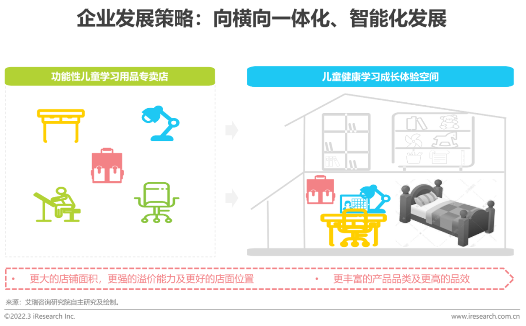 创变时代:企业向横向一体化、智能化发展功能性儿童学习用品市场持续扩张,竞争也更加激烈和白热化,企业需在产品及业务模式上进行创新,方能维持及扩大市场份额。现有产品创新上,头部品牌开始探索增加智能元素,如通过增加智能升降、智能监护等功能来满足高端用户需求;业务模式创新上,头部品牌在已有市场获得领先地位后,开始开拓新的产品线及业务,如进一步向学习儿童家居市场,如儿童床,及儿童学习内容/工具市场,如儿童智能学习平板、儿童学习文具等领域延伸。