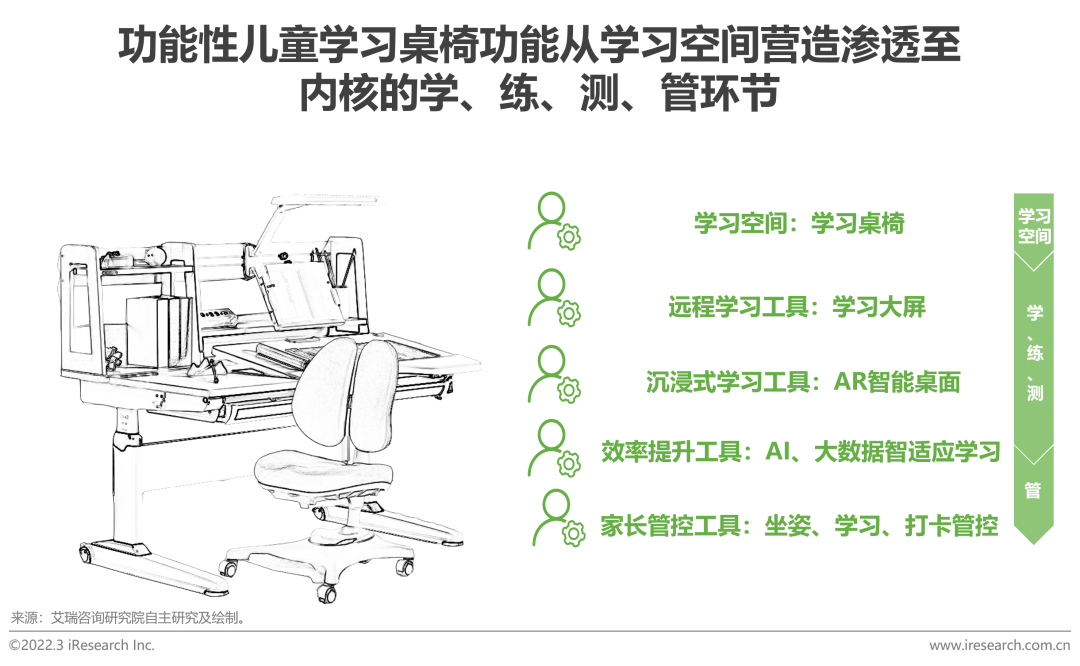 长期趋势从学习空间向学习过程核心环节的渗透儿童学习桌椅行业属于家具行业的细分领域,核心功能是为儿童学习营造舒适健康的学习环境。随着在线学习兴起、新型显示材料在教育领域的应用(如纳米黑板、LED大屏等),以及AI、大数据、VR/AR等新一代信息技术向教育领域的渗透,儿童学习桌椅作为儿童居家学习的承载主体,具备天然的升级整合优势,既可以成为学习空间,又能成为学习、管控载体,从家具行业向教育核心环节渗透。