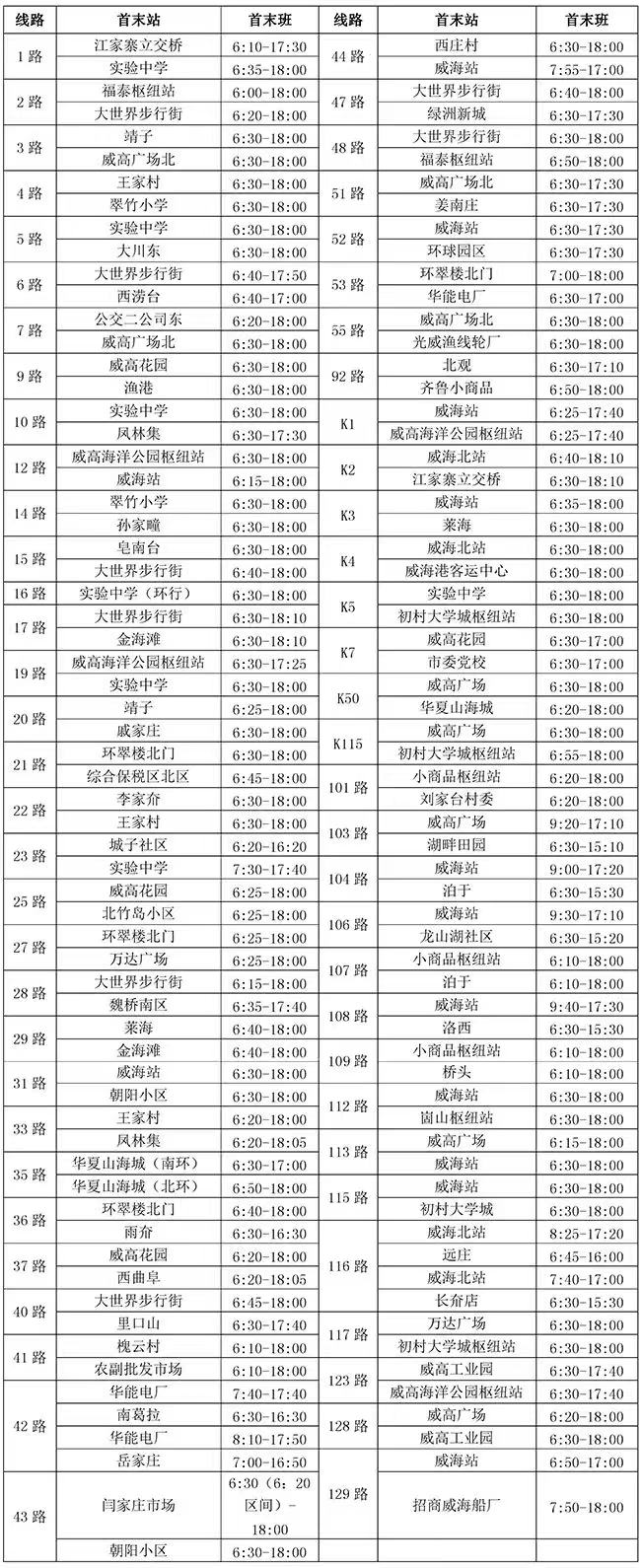 K1、K2、K3、K4、K5、K7、K50、K115、1、2、3、4、5、6、7、9、10、12、14、15、16、17、19、20、21、22、23、25、27、28、29、31、33、35、36、37、40、41、42、43、44、47、48、51、52、53、55、92、101、103、104、106、107、108、109、112、113、115、116、117、123、128、129路,线路运行时间6:00-18:10,班次间隔时间高峰10-40分钟、平峰30-90分钟。