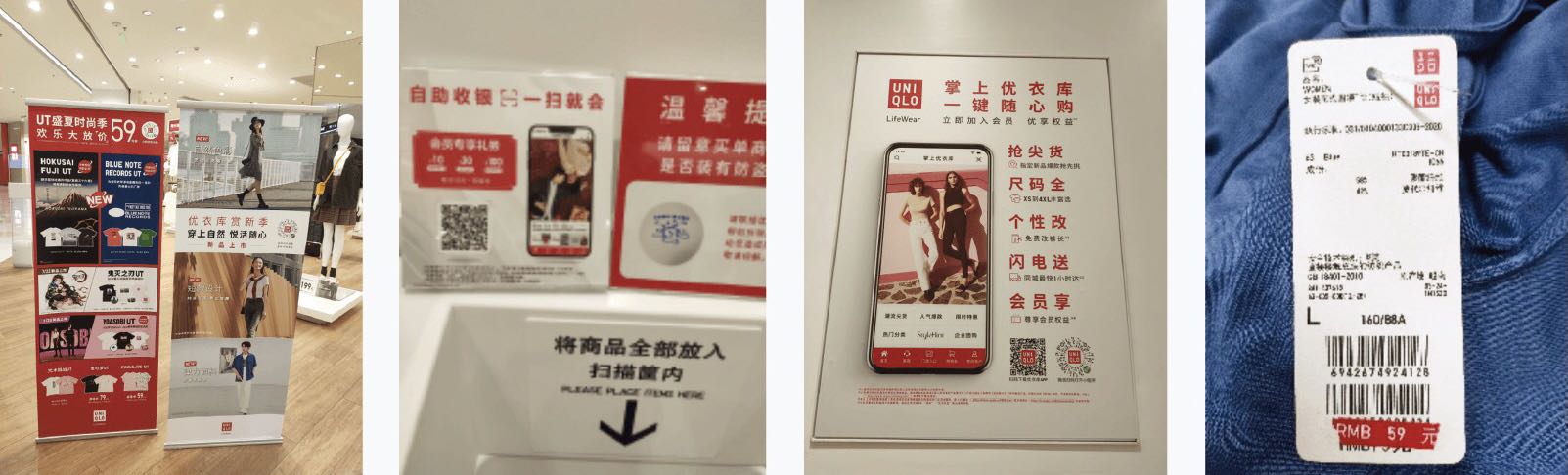 现在走进优衣库的门店你会发现,无论是商品标签、海报,还是试衣间、结账台、导购都在引导你关注优衣库的微信小程序。如果出现门店某件尺码缺货的情况,或者单纯不想花时间排队试衣,你还能用微信小程序扫描服装吊牌上的条形码来线上下单。