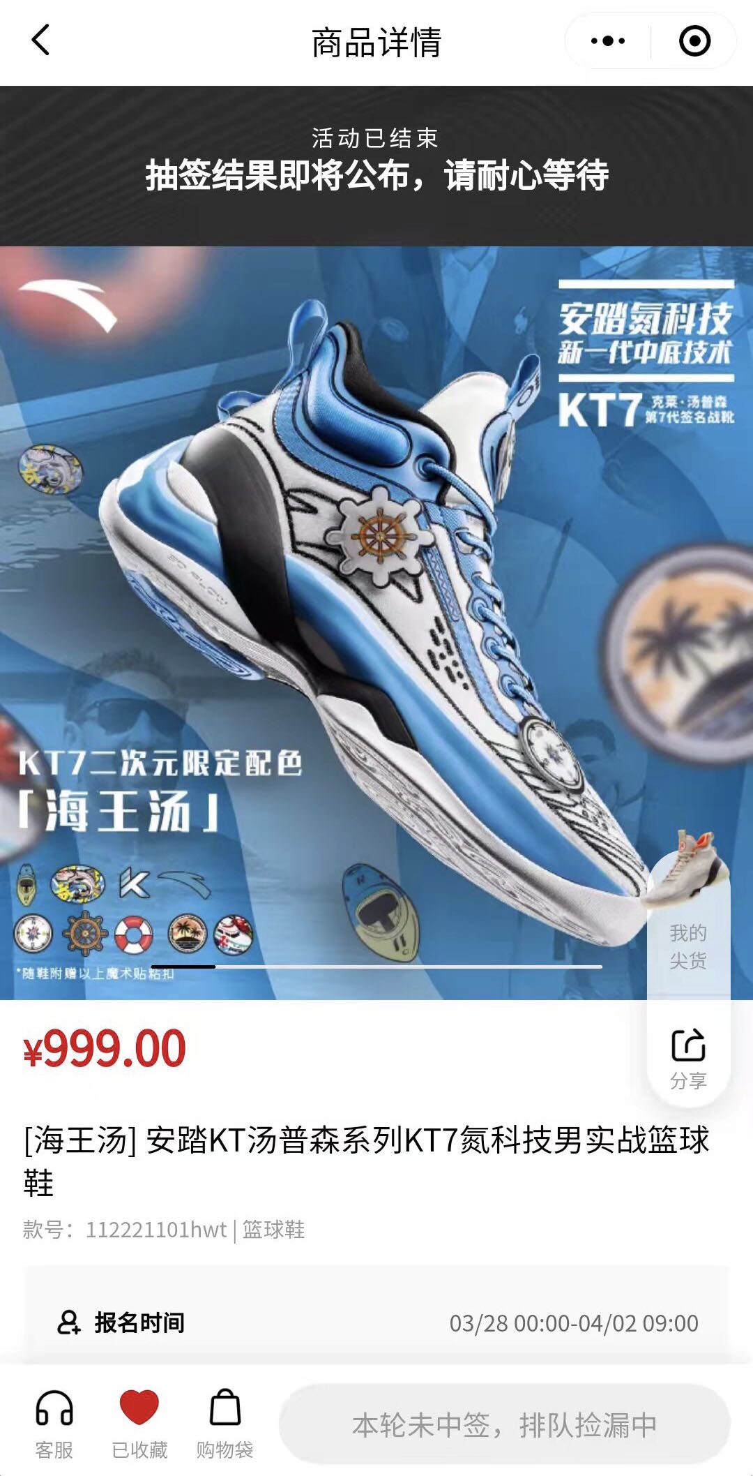 安踏还会不定期通过公众号和小程序来进行尖货发售。此处“尖货”指的是凝聚品牌价值和潮流取向的限量款商品,比如安踏的KT系列是安踏和NBA 球星 Klay Thompson合作的限量球鞋系列。2018年,作为安踏旗下第一款全球限量发售350双的球鞋,KT3-Rocco款战靴曾在美国进行了总量200双的限量销售,旧金山NiceKicks鞋店外千人哄抢。