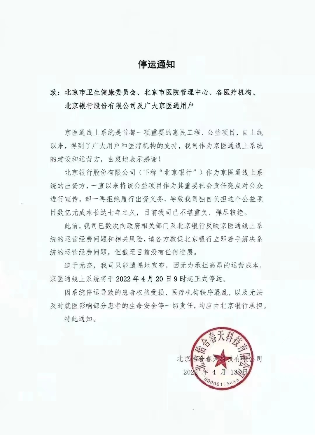4月18日晚间,一则落款为关于“京医通”停运公告在网络流传。公告显示,北京银行作为京医通线上系统的出资方,拒绝履行出资义务,北京怡合春天科技有限公司(下简称怡合春天)已无法独自负担这个公益项目,京医通线上系统将于4月20日9时起正式停运。