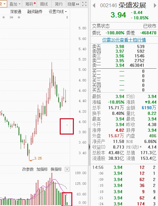 4月19日,荣盛发展(002146.SZ)股价开盘即一字跌停,直到收盘时仍有超过46万手的巨量卖盘“封死”跌停;全天成交6190万元、15.71万手,换手率仅0.4%,不足前一日的三分之一。