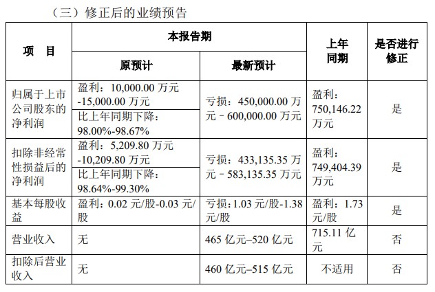 业绩预告显示,预计2021年度扣除非经常性损益后的净利润为盈利0.52亿元至1.02亿元(同比下降98.64%-99.30%);4月18日晚间公告则将其修正为亏损43.31亿元至58.31亿元之间。