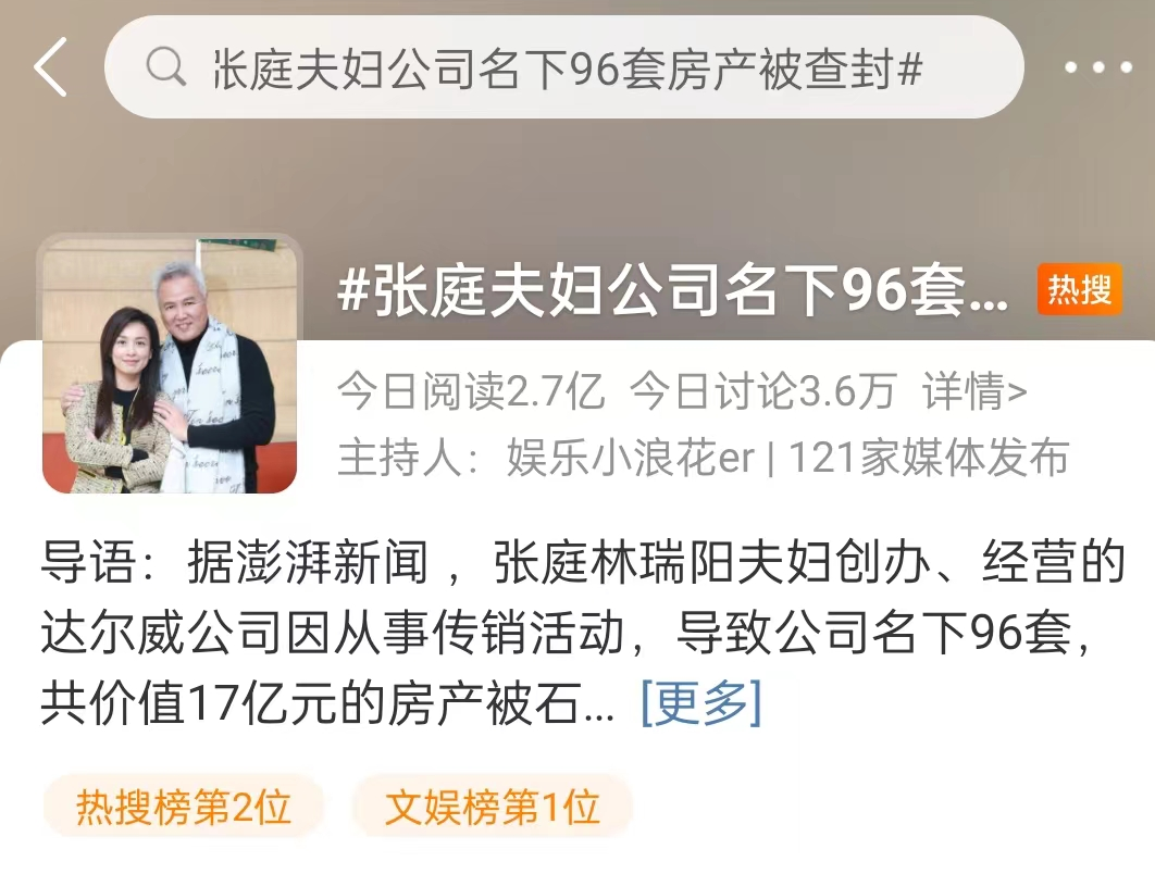 截至记者发稿,关于“张庭夫妇公司名下96套房产被查封”话题阅读量已达2.7亿。