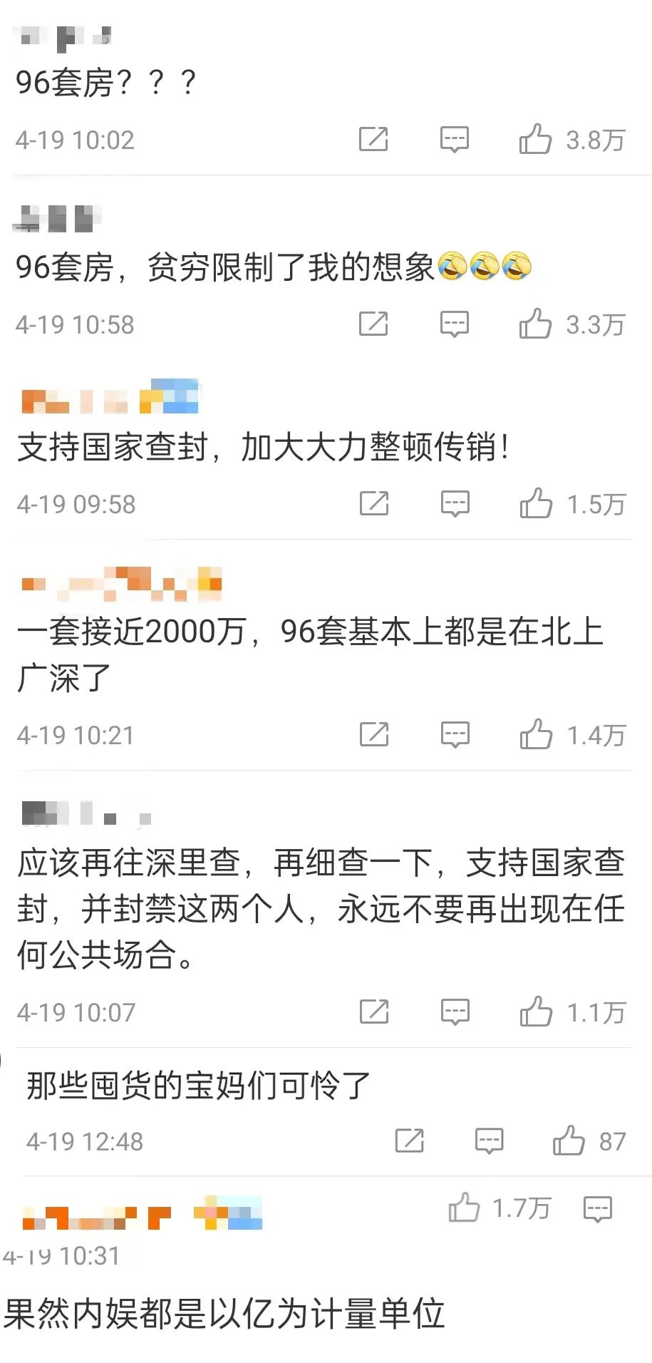 有网友还表示,“没收全部财产,封杀张庭夫妇。”“支持国家查封,加大力度整顿传销。”也有一些网友对囤货的代理商表示惋惜,以及对于内娱明星财产感到震惊。