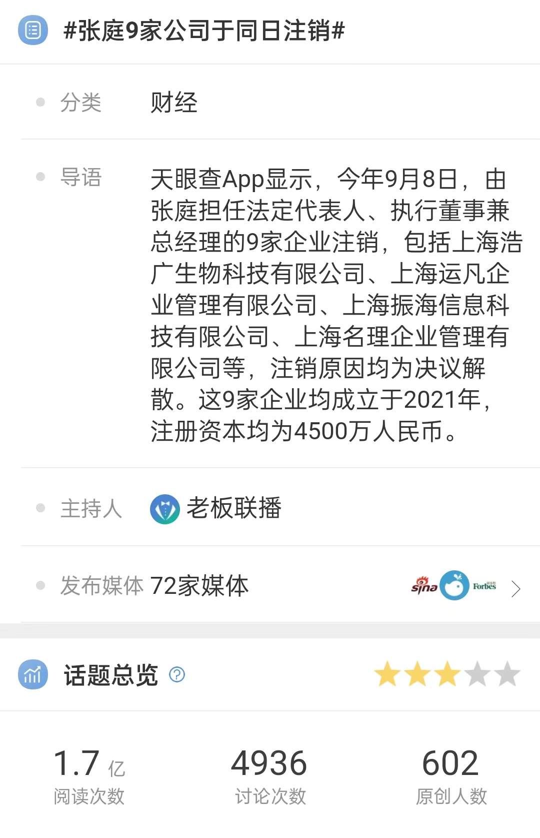 更早在2021年7月,达尔威因涉嫌传销,被湖北省襄阳市保康县市场监督管理局以“为防止被申请人转移或者隐匿违法资金”为由,向保康县人民法院申请冻结达尔威公司及其相关公司共3亿资金。同年9月8日,天眼查显示,由张庭担任法定代表人、执行董事兼总经理的9家企业注销。微博有关“张庭9家公司于同日注销”的阅读次数达1.7亿。