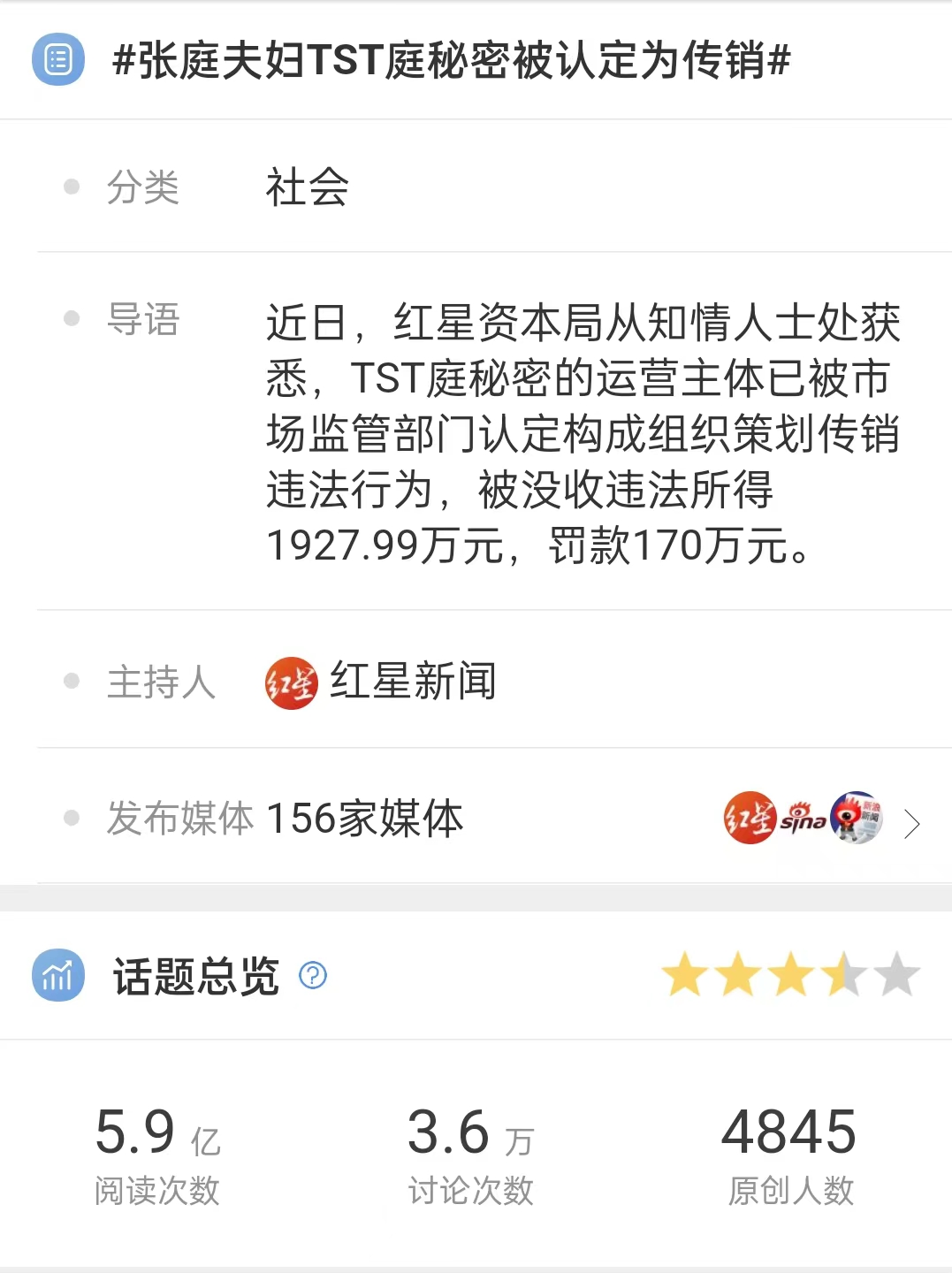 4月9日,一则标题为“张庭夫妇TST庭秘密被认定为传销”登上微博热搜。截至今日(4月19日),该话题共5.9亿次阅读数。