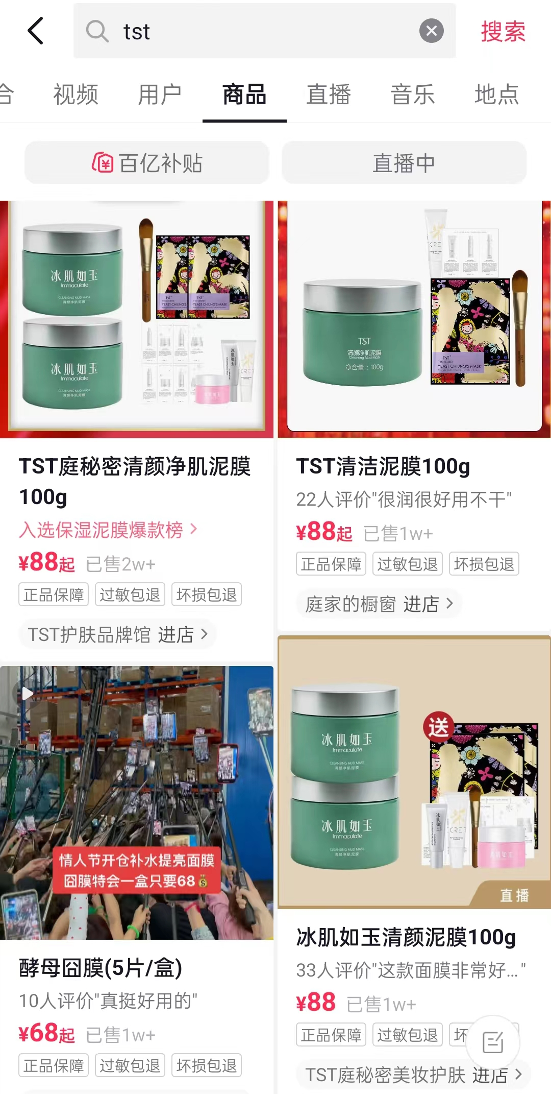 在抖音APP客户端搜索“TST”相关商品信息,结果显示,排名前几的商品销量多在1万件以上。