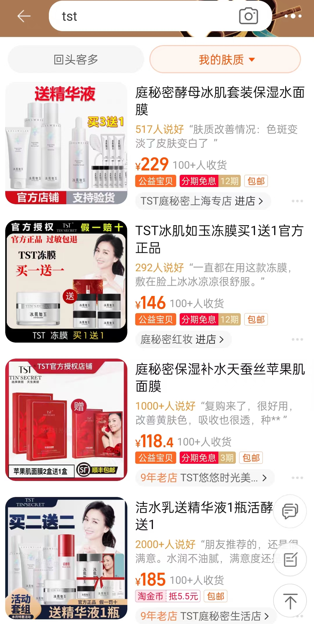 在淘宝搜索“TST”相关商品信息,排名前几店铺售出商品都在100以上。