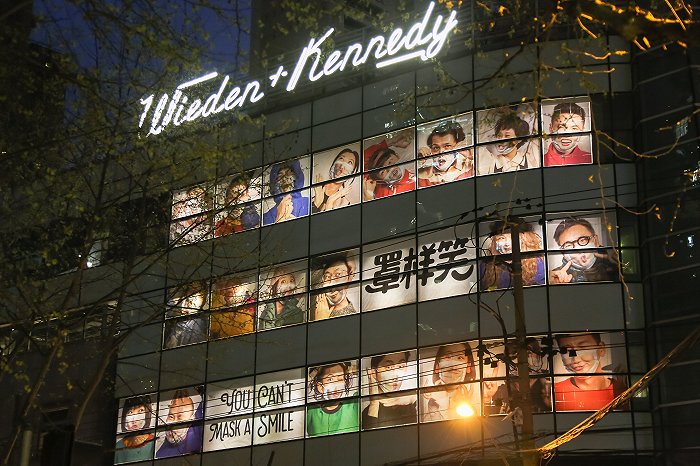 譬如我们曾经报道过的,上海W+K广告公司在2020年4月发起了一个名为“罩样笑”的主题公益向活动——以谐音梗来表达,以及在口罩上P笑脸的搞怪肖像照作为视觉形式。W+K上海先是找来员工作模特,拍摄成巨幅海报贴在了上海办公室所在的大楼窗户上,从户外看,整个大楼变成了一个临时巨型灯箱;随后这家广告公司又以自己的照片为效果图,邀请周围的邻居小店加入,为店主和员工们拍摄“罩样笑”的海报。后来甚至重新营业不久的武汉楚河汉街GAP门店,也挂上了这组海报。