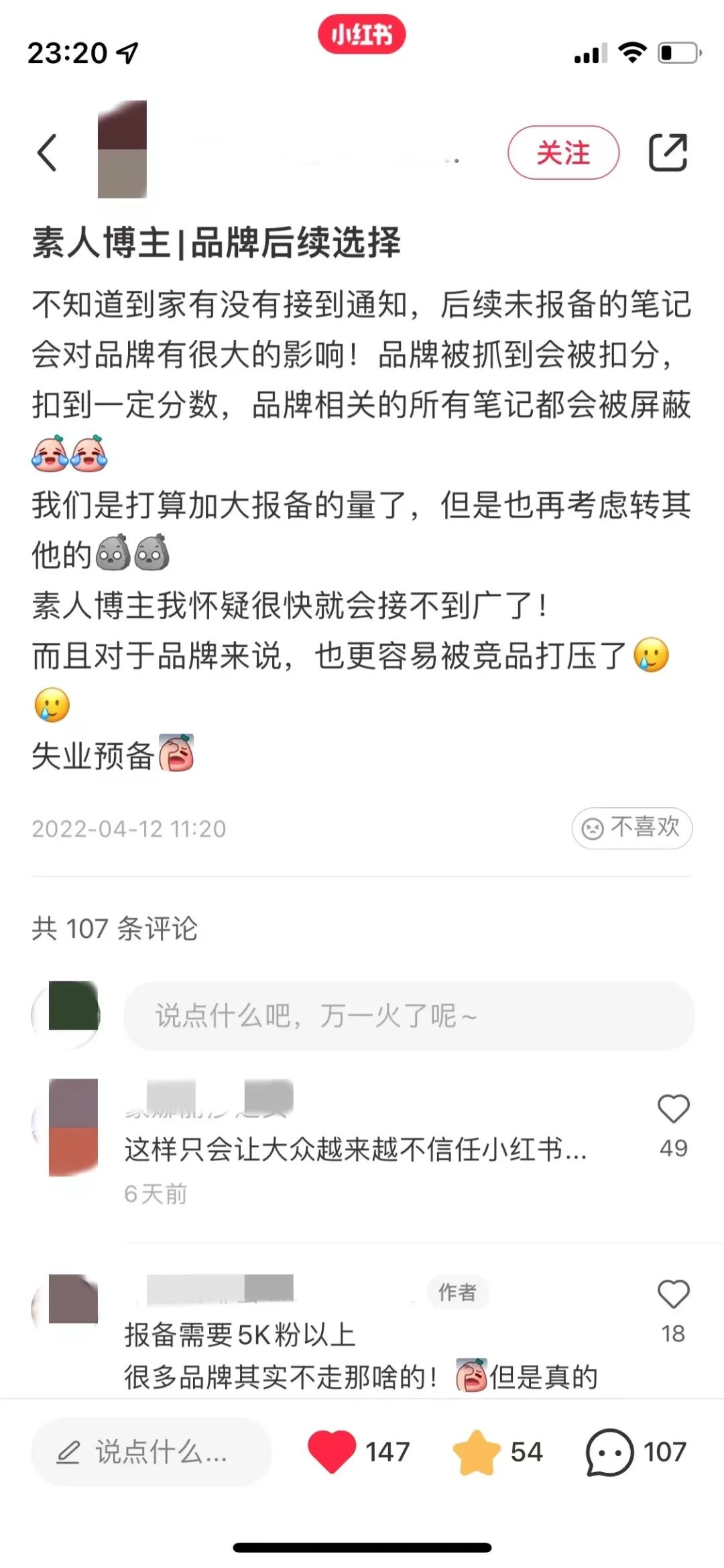 “感觉快‘失业’了。素人的笔记我们都已经暂停发布,同时也让公司也让我们pr暂停了bd素人的工作。”