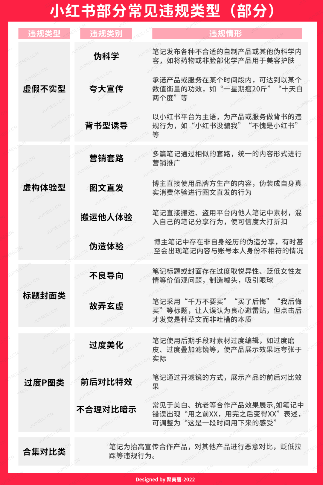 与此同时,针对品牌方对于违规笔记的内容,小红书平台发布了更详细的违规类型,记者做了部分整理,表格如下: