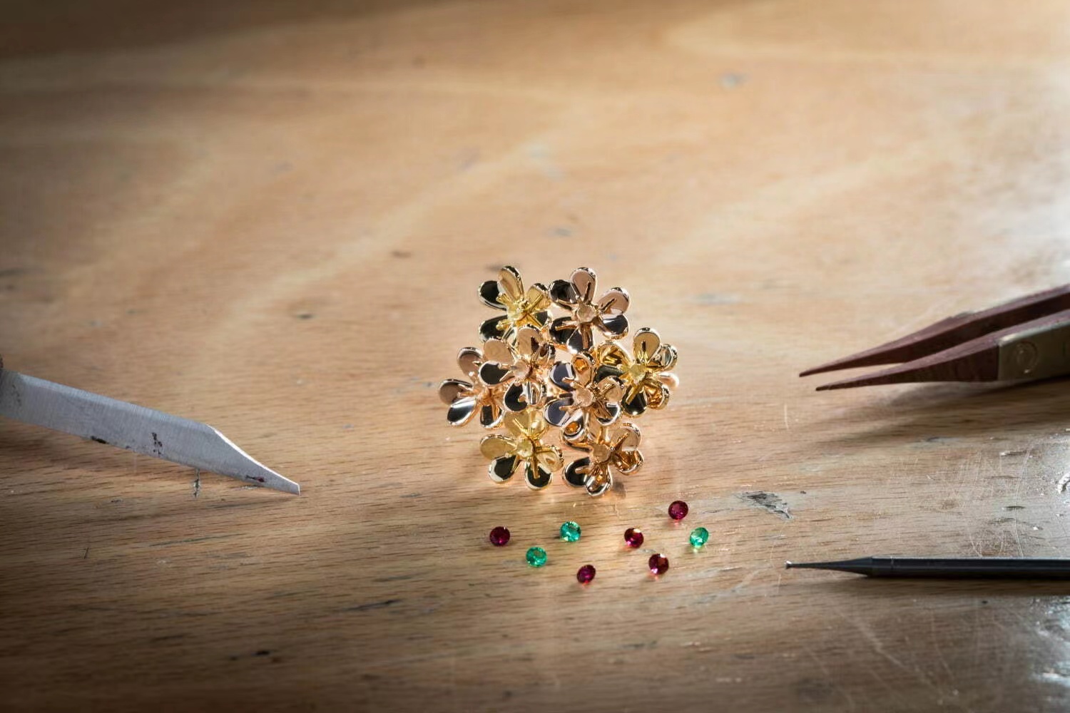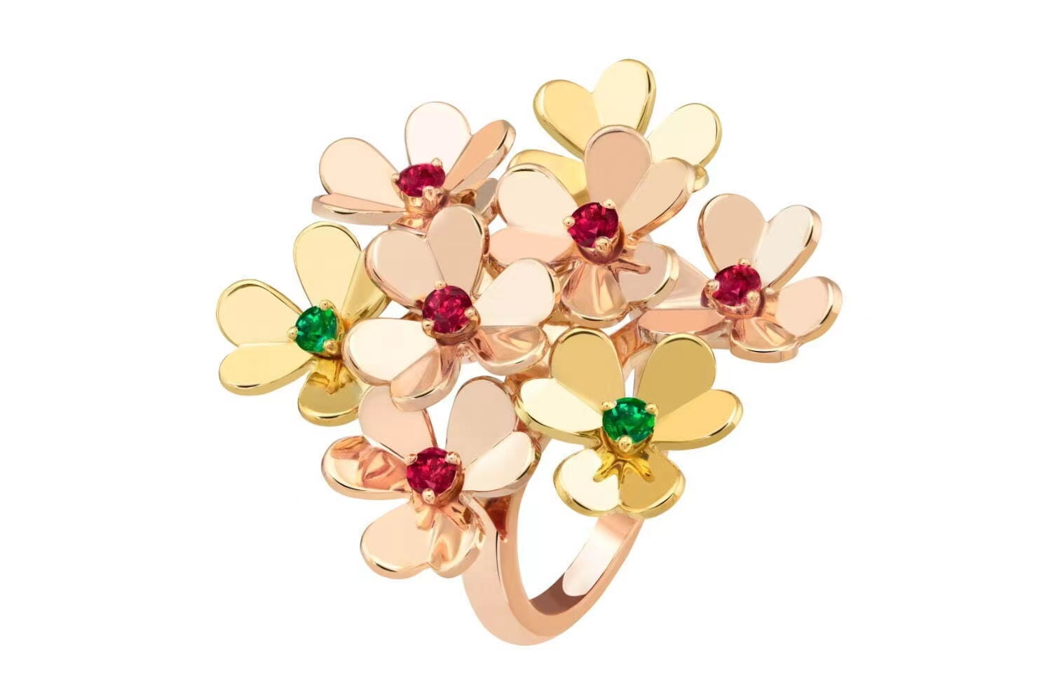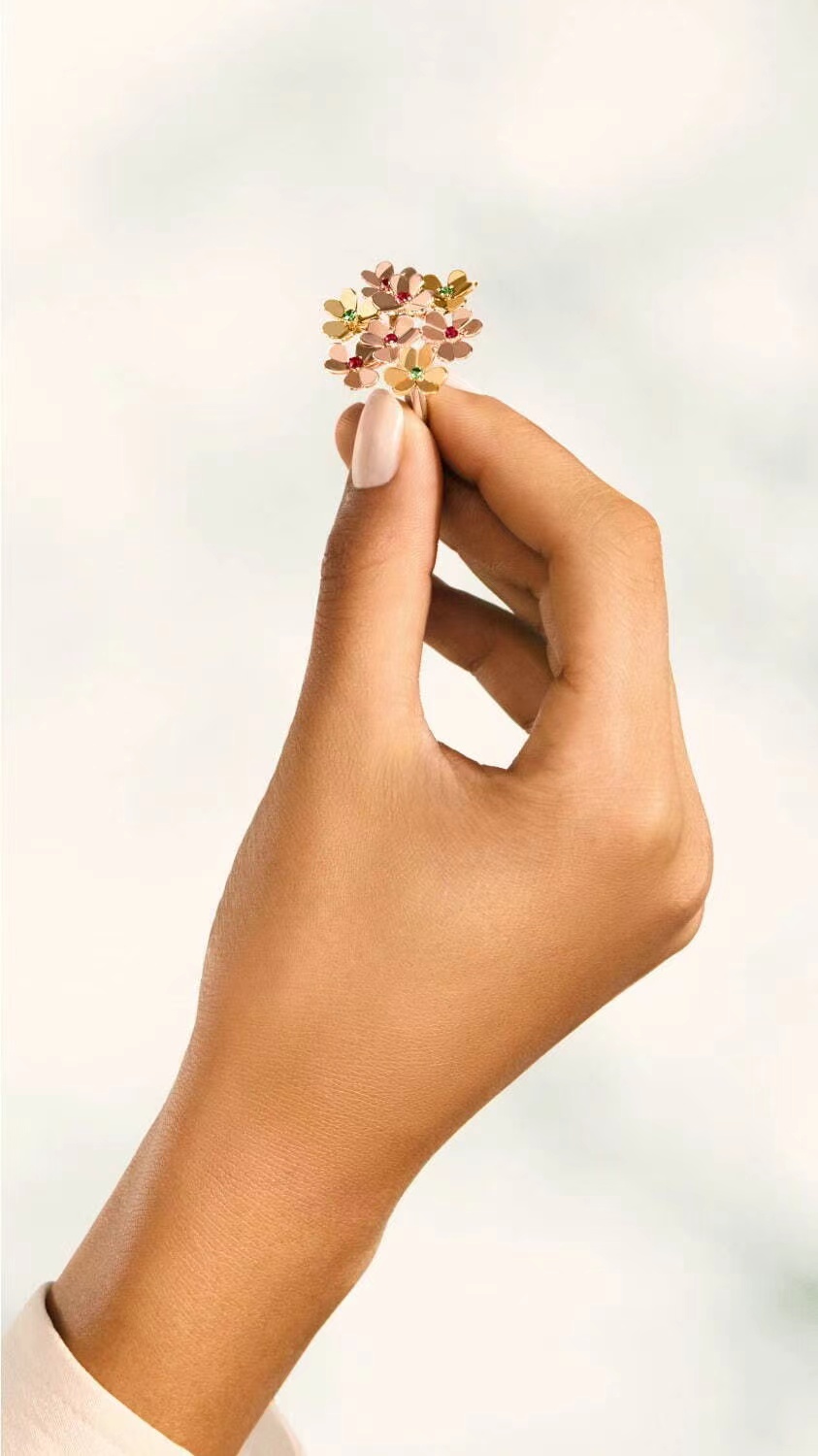 优美花卉在梵克雅宝“Frivole”繁花系列中绽放耀眼的光芒。花瓣采用镜面抛光工艺或铺镶钻石的金质打造,每一朵花卉争相开放,精致迷人。此次,Van Cleef & Arpels为繁华系列增添缤纷色彩,花蕊处替代钻石的是翡翠与红宝石。花束戒指上几朵花卉一同张开花冠,温暖璀璨的红宝石,绿翡翠跃然眼前。
