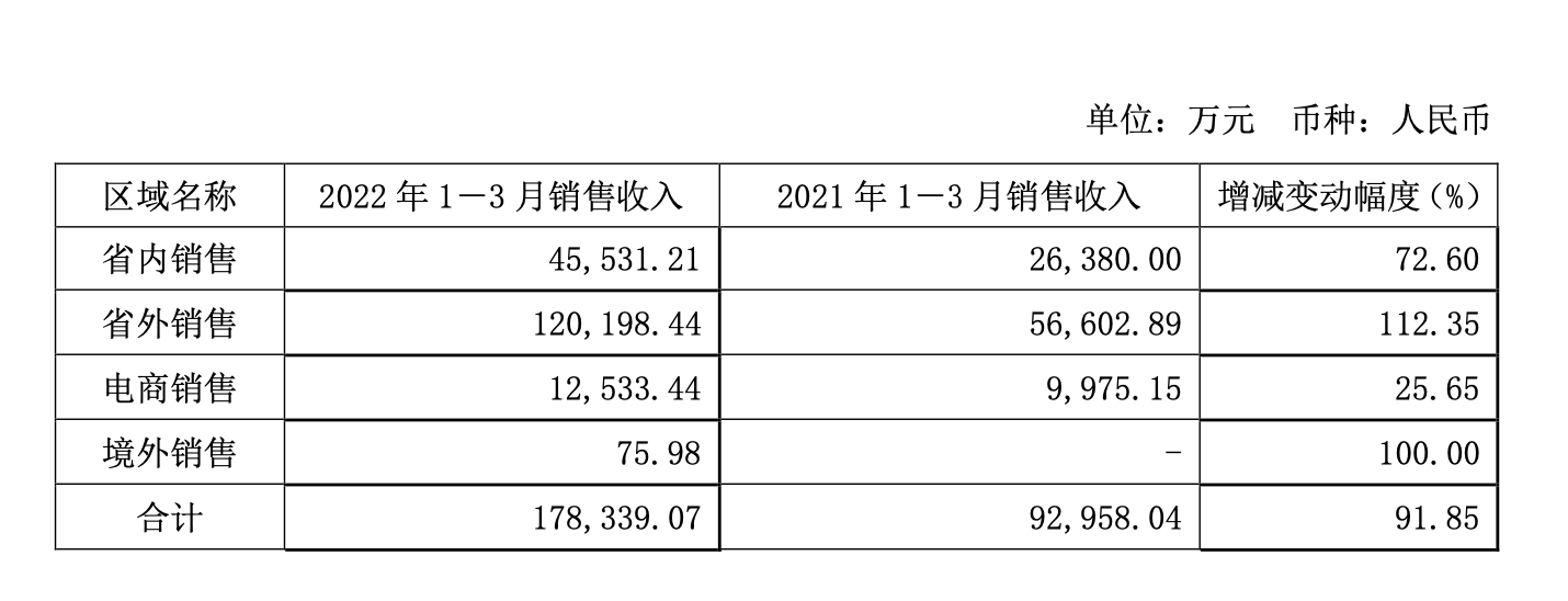根据公告显示,今年1-3月,舍得酒业在省内市场、省外市场实现销售收入分别为4.55亿元以及12.02亿元,同比提升72.6%、112.35%。