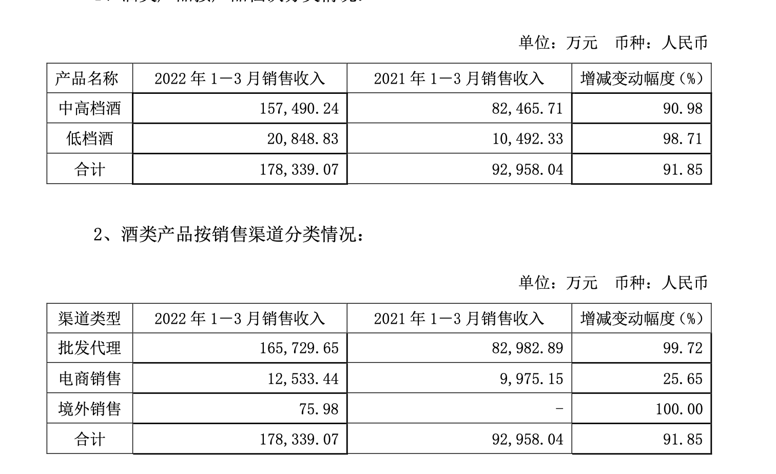 此外,今年1-3月舍得酒业批发代理渠道以及电商销售渠道分别实现销售收入16.57亿元、1.25亿元,同比2021年同期8.3亿元、9975万元,同比提升99.72%、25.65%。