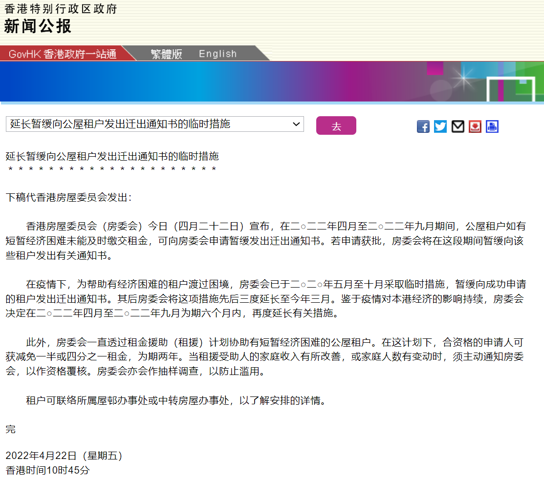 在疫情下,为帮助有经济困难的租户渡过困境,房委会已于2020年5月至10月采取临时措施,暂缓向成功申请的租户发出迁出通知书。其后房委会将这项措施先后三度延长至今年3月。鉴于疫情对香港经济的影响持续,房委会决定在2022年4月至2022年9月为期6个月内,再度延长有关措施。