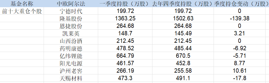 相比医疗类主题基金,中欧阿尔法作为葛兰管理的第一只全市场混合基金,截至一季度末规模达到了109.06亿元。一季度,该混合基金持仓变动不大,前十大重仓股中没有新增个股。