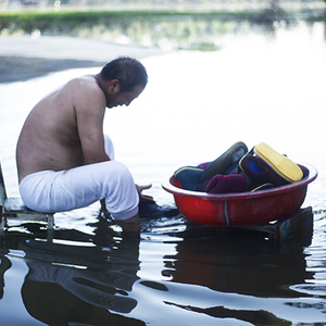 沿着黄红华家门口的小路,穿过一片农田,就是刘丁的家。在他眼前,原本的路和农田已是一片湖面,有村民在小路上用还未消退的洪水洗鞋子。而刘丁家里的水位,仍然很高。