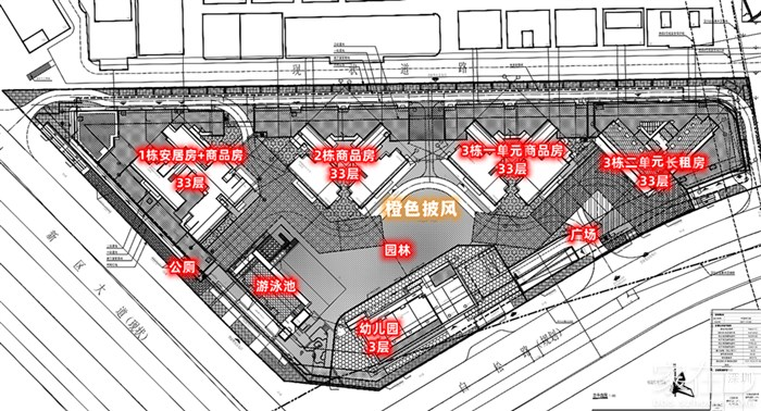 项目规划4栋建筑的纯住宅小区,其中住宅(含保障房)3栋,层高为28/41/43层;自带1栋6班幼儿园,层高为4层、社康中心等配套,属于较纯粹的居住社区。