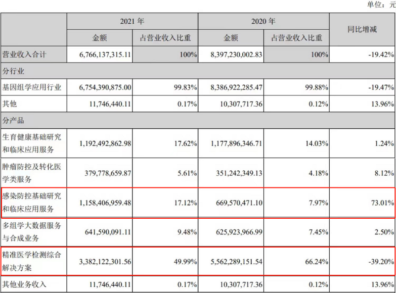 那么华大基因新冠检测业务的“暴雷”出现在精准医学综合解决方案上。该业务2021年营业收入同比减少21.80亿元,毛利率下降1.31%。