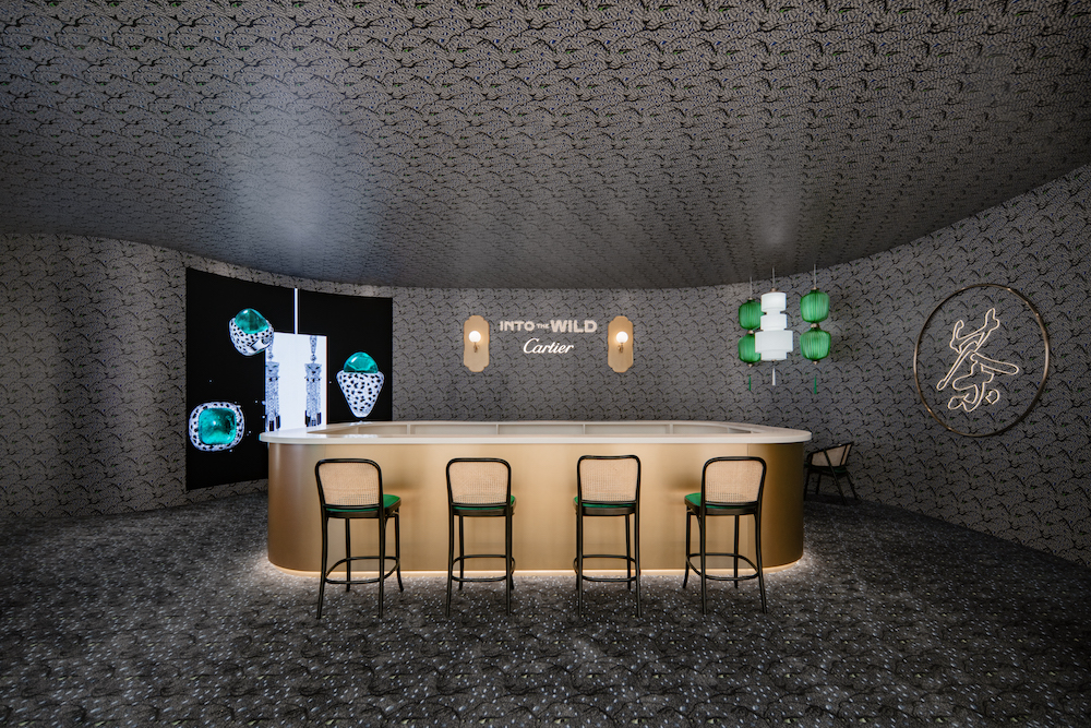 与此同时,卡地亚首家猎豹茶坊应运而生。茶坊中以规则排布的豹首图案为背景,闪耀祖母绿豹眼色泽的墨绿色调呼应川蜀饮茶的闲情逸致。来宾在这一宛如丛林的空间中,感受猎豹与东方美学和生活方式的惊喜碰撞。