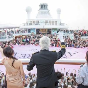 网上流传这样一张图片:一艘大型邮轮的二楼甲板上,站着林瑞阳、小陶虹和张庭等一众明星。其中林瑞阳戴着白手套,穿着船长制服,行“军礼”。