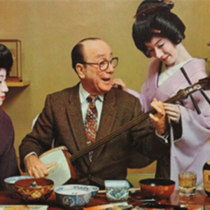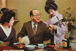 1972~1973的新闻广告上,左图为一个人的河豚宴,配字「河豚刺身,还有人情」。右图为祝寿的喜宴场景,三得利自然也是这些场景不可或缺的因素。