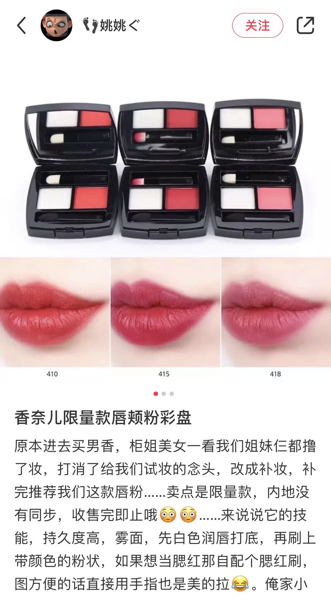 实际上,早在2018年香奈儿CHANEL也曾出过类似的唇粉盘,只不过仅有单色。而唇粉盘似乎更像香奈儿的一个尝试方向,该产品后续并未有更多的推广和迭代。有消费者在小红书上表示,唇粉盘虽然使用流程有些复杂,但胜在仪式感。
