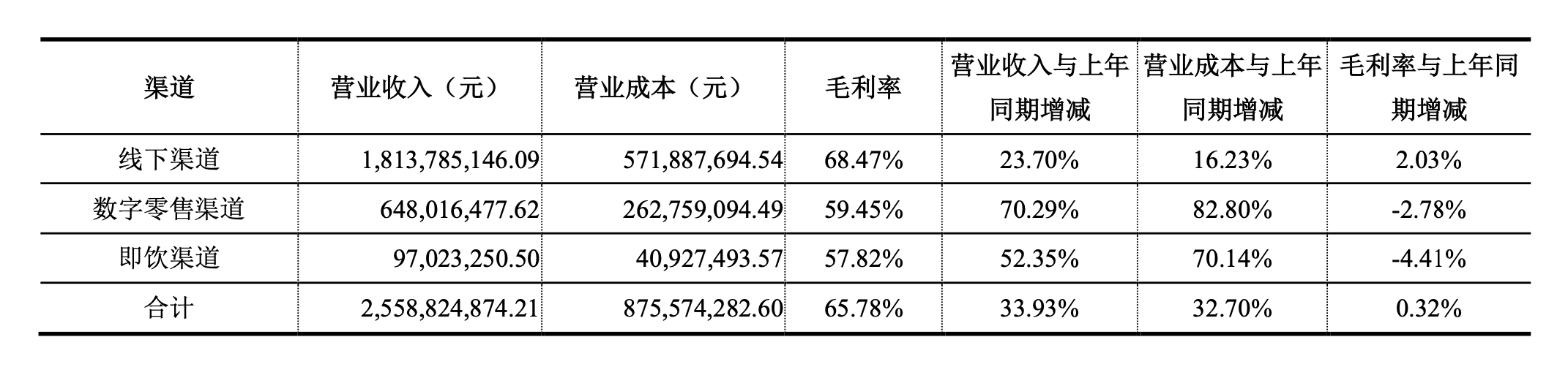 去年百润股份主营业务线下渠道仍为主要销售渠道。根据公告显示,2021年百润股份线下渠道、数字零售渠道、即饮渠道分别实现营业收入18.14亿元、6.48亿元、0.97亿元,同比提升23.7%、70.29%、52.35%;毛利率分别为68.47%、59.45%、57.82%,同比提升2.03%、-2.78%、-4.41%。