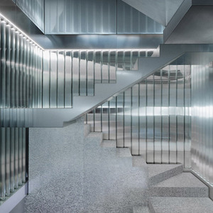 想让门店能被轻易看见的方法很简单。OMA和Data为门店选择了普通珠宝店非常少使用的铝合金和镜面材料作为主要装修建材,希望以此从“根本上”能让门店变得不一样。铝合金材料让整个空间充满了科技感,而镜面则通过摆放位置和角度的策划,用折射后形成的不同视觉角度以及变色效果,让空间变得更为灵动。这些都是和普通珠宝店奢华、典雅的风格特别不同的地方。