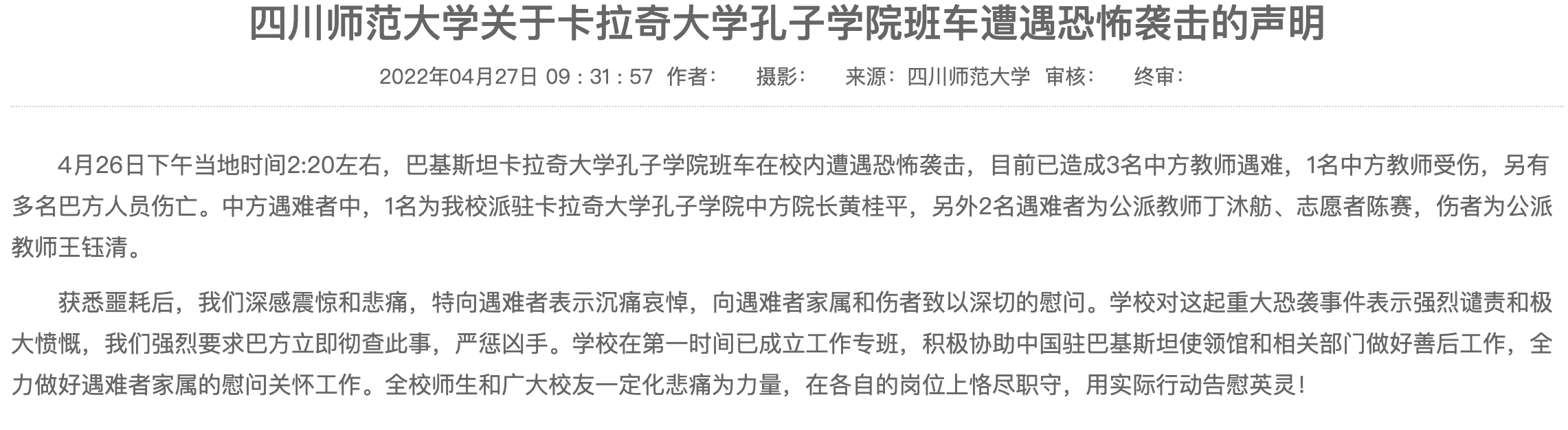 四川师范大学次日于官网证实,中方遇难者中,1名为该校派驻卡拉奇大学孔子学院中方院长黄桂平,另外2名遇难者为公派教师丁沐舫、志愿者陈赛,伤者为公派教师王钰清。