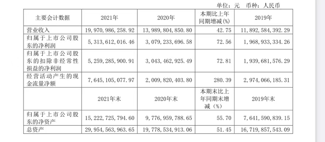 4月27日,山西汾酒发布《2021年年度报告》显示,2021年实现营收199.71亿元,同比增长42.75%;净利润53.14亿元,同比增长72.56%。