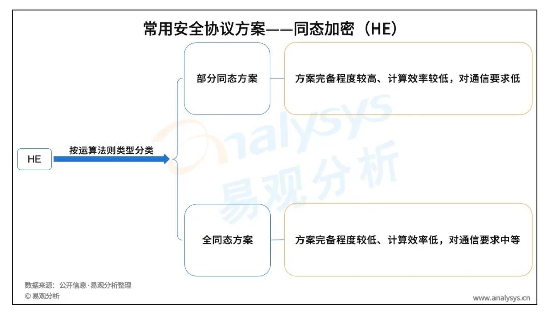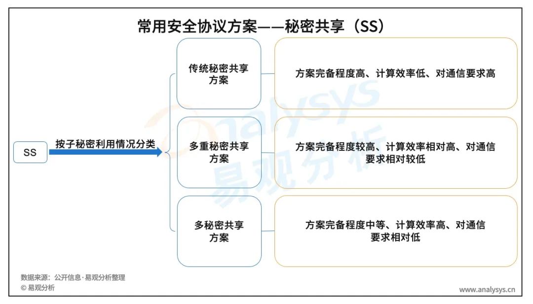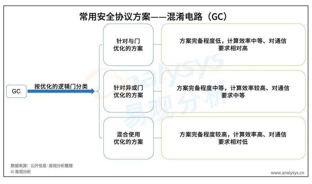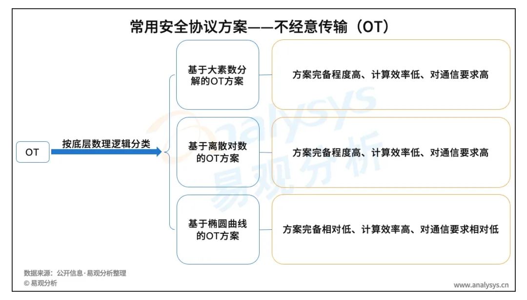 在多方安全计算的实际应用中,根据分布式多方安全计算对性能的要求,会选择不同的常用安全协议方案。多方安全计算常用安全协议方案在实现难度和性能表现方面都存在很大差异,易观分析建议技术使用方在分布式多方安全计算的实际应用中应关注自身现有和未来规划的计算与通信能力,结合常用安全协议方案的完备程度,选择合适的安全协议方案。
