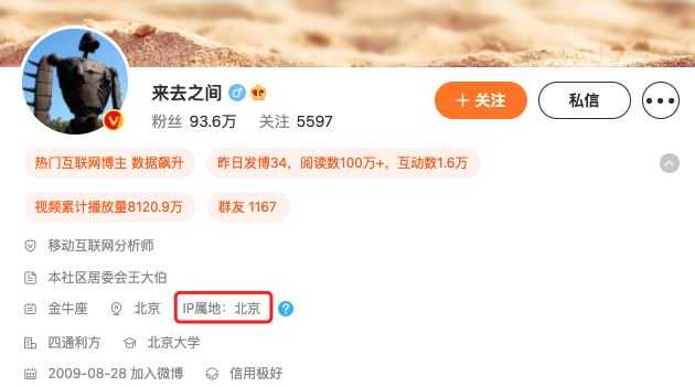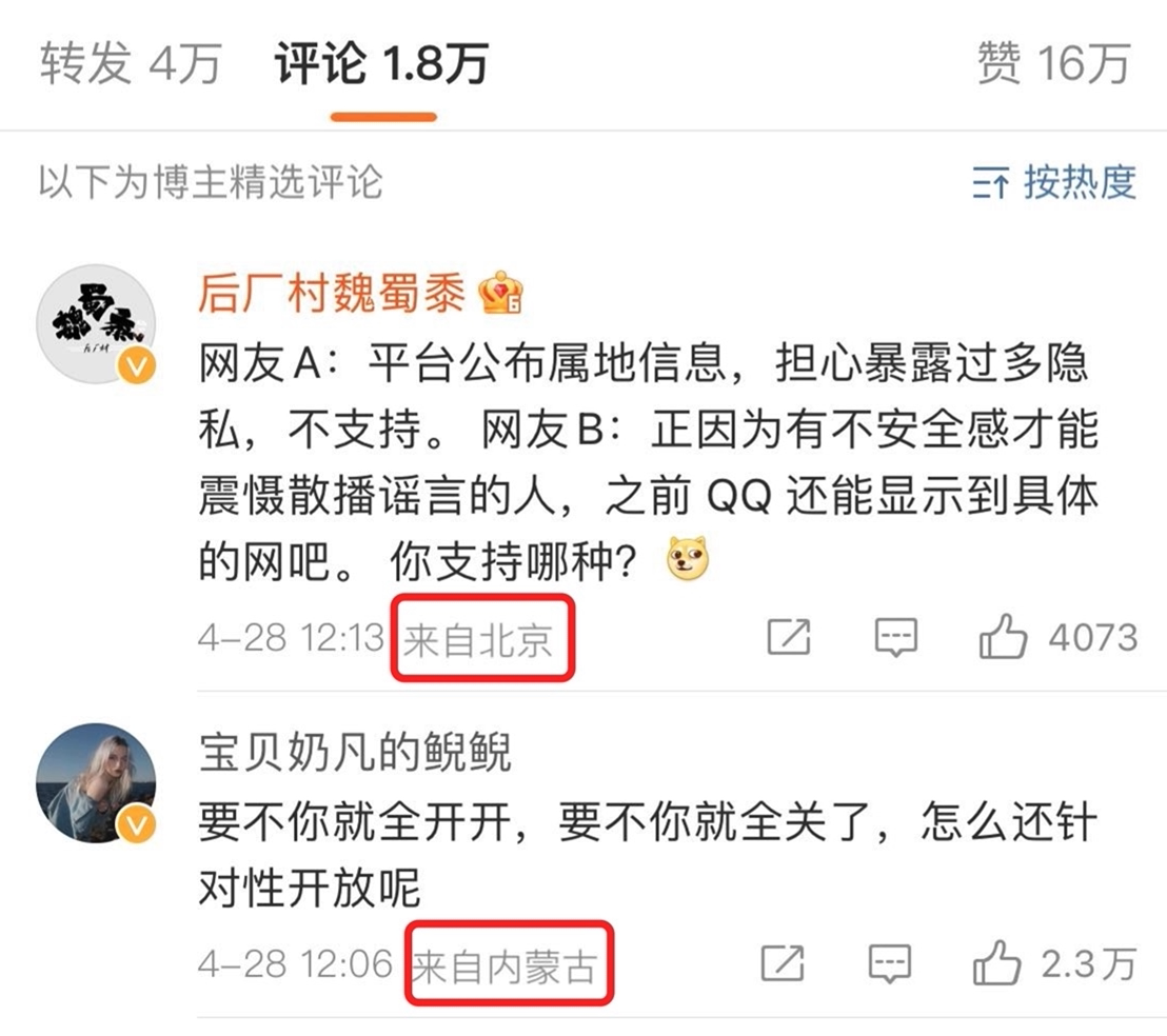 此前,微博称为减少冒充热点事件当事人、恶意造谣、蹭流量等不良行为,确保传播内容的真实、透明,于今年3月上线展示用户“IP属地”功能。