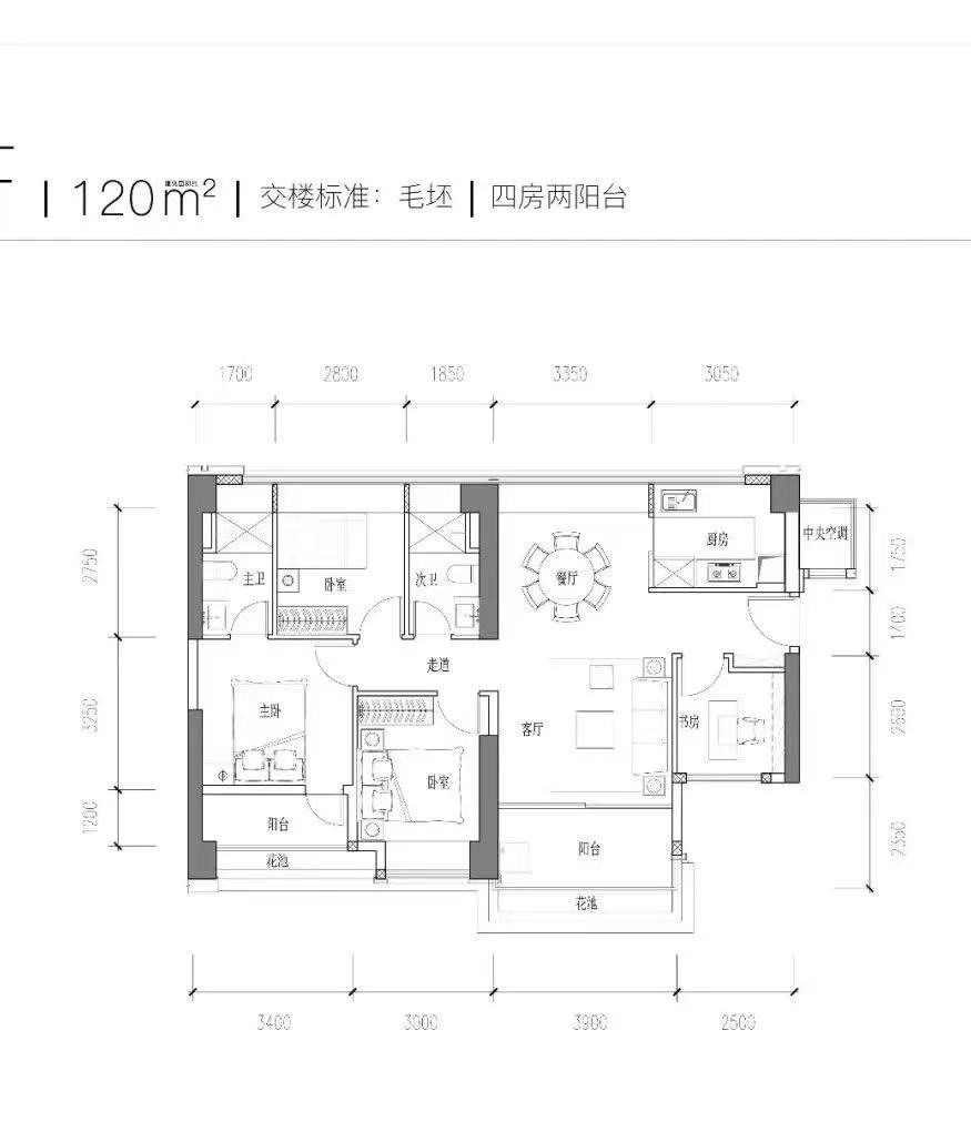 建面约120平方米的户型为四房两厅两卫,客厅带有一个宽阔阳台。